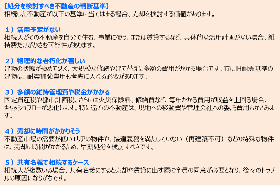 相続発生時において、不動産資産を処分すべきか判断する際の基準は、その不動産が相続人にとって「負の資産」となる可能性がないかを評価することです。負の資産とは、所有しているだけで経済的・精神的な負担が増える物件を指します。