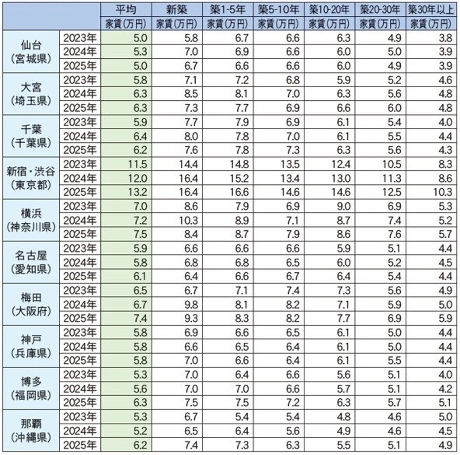 「SUUMO」に掲載されている単身物件の賃料を経年で調べたところ、2023年4.6万円→24年4.7万円→25年4.8万円と、1000円ずつ賃料相場が上がり、24年の見立てでは、新築・築浅物件だけ上昇して平均を上げている。という分析だったが築古にも家賃上げの兆しが出始めている。