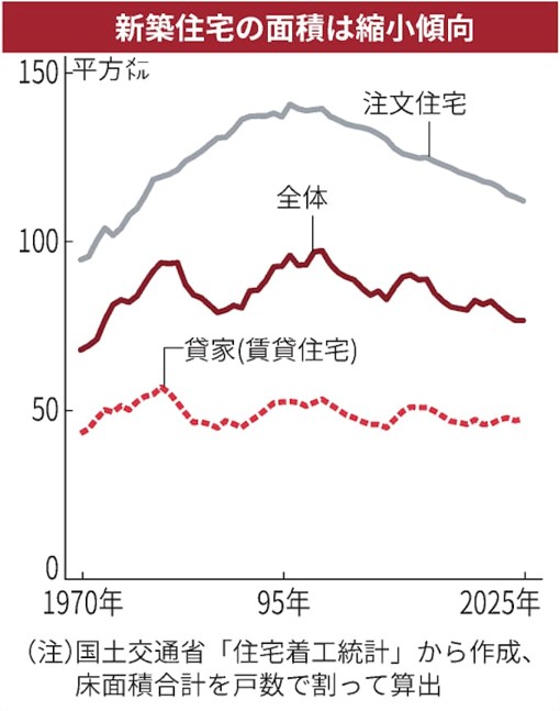 不動産価格の高騰が連日ニュースを賑わせていますが、その裏で静かに進行しているもう一つのトレンドをご存知でしょうか。それは「住宅面積の縮小(狭小化)」です。国土交通省の統計によると、2025年の新築住宅(1戸当たり)の平均床面積は約76.8平方メートルとなり、2年連続で1970年代前半以来の狭さを記録しました。今回は、住宅市場で起きている「狭小化」の背景と、これからの時代に選ばれる物件づくりのポイントを解説します。